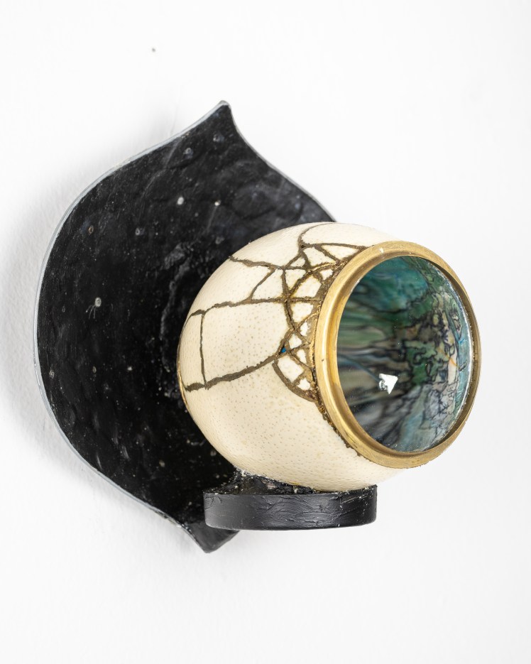 Keyhole hangers are attached to the back of a piece, then slide down over the head of a screw in the wall. For a video demo of this piece, follow the QR code on the kit’s lid.